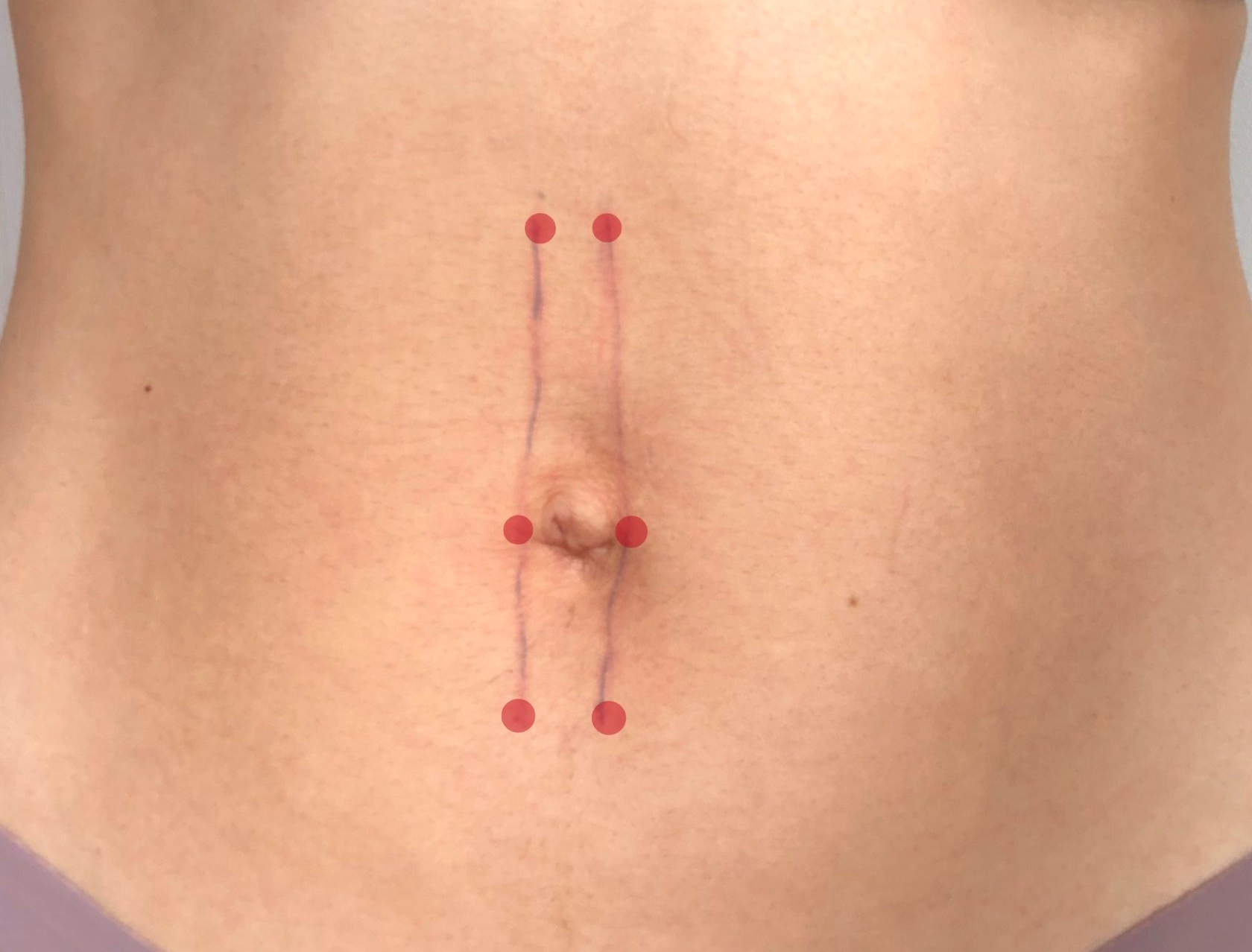 - Берём ручку и делаем пометки в трех точках: на уровне пупка, на три пальца выше пупка и на 2 пальца ниже пупка;